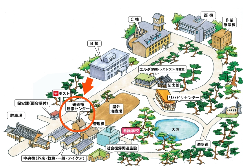 場 所:福間病院内 研修棟2階 ※赤マーカー箇所
